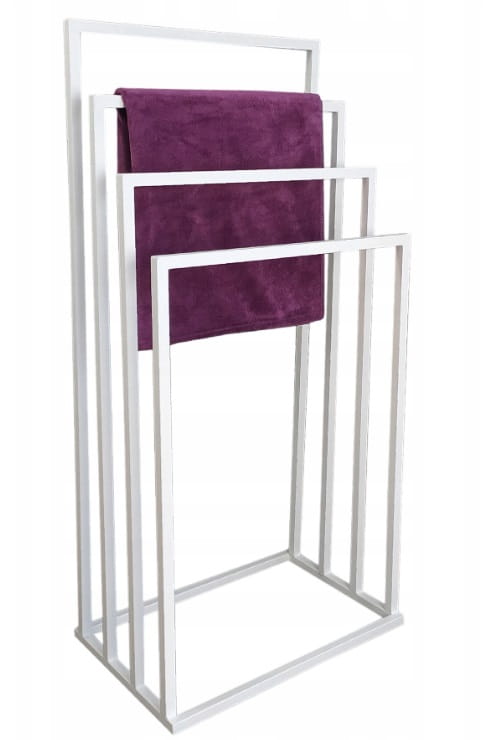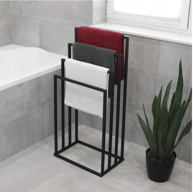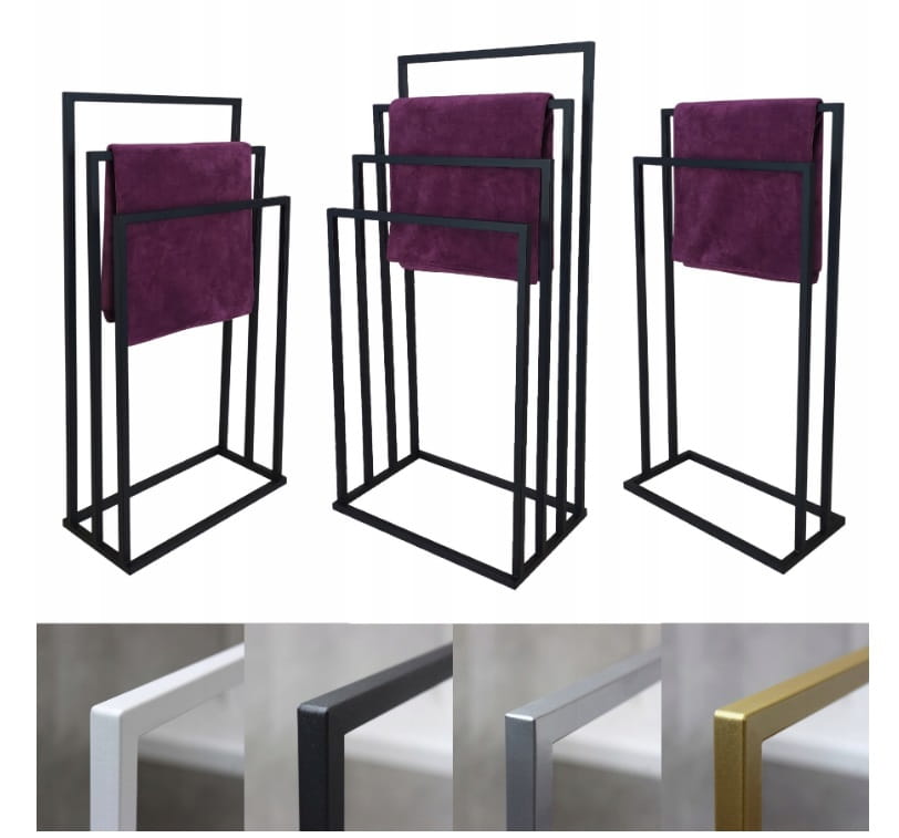 Solidny, 2-ramienny stojak na ręczniki wykonany ze stali malowanej proszkowo na kolor czarny - mat, strukturalny. Sposób malowania sprawia, że jest przystosowany do użytku w pomieszczeniach o dużej wilgotności, łazienkach, saunach.