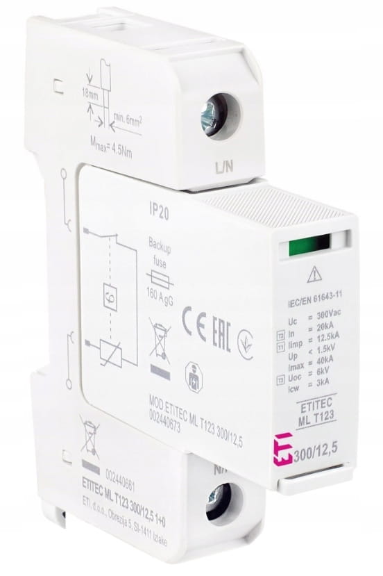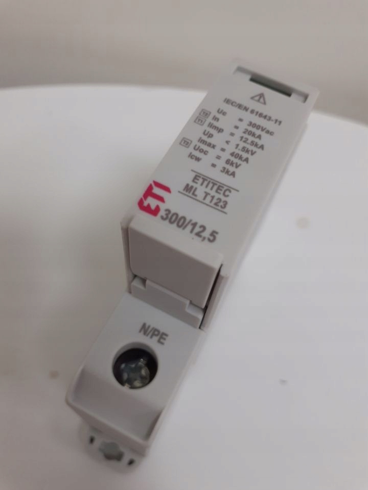 Ograniczniki przepięć ETITEC T123 300/12,5 są przeznaczone do zastosowania wewnętrznego w rozdzielnicy głównej jako Typ1 lub Typ2 lub Typ3 zabezpieczenia przed przepięciami wywołanymi wyładowaniem atmosferycznym bezpośrednim, pośrednim lub łączeniowym. Każdy ogranicznik wyposażony jest w zabezpieczenie termiczne, które w przypadku przepływu prądu wyładowczego lub zwarciowego większego od Imax odłączy ogranicznik od sieci. W przypadku uszkodzenia ogranicznika aktywowane jest wewnętrzne zabezpieczenie termiczne i sygnalizacja jego uszkodzenia - wyraźny kolor czerwony w okienku kontrolnym.