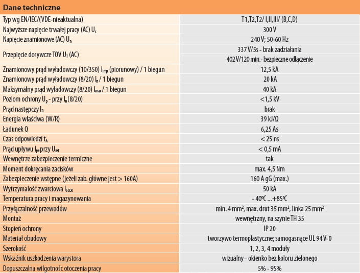 - optyczny wskaźnik uszkodzenia warystora (zielony - OK, brak koloru zielonego - uszkodzenie)