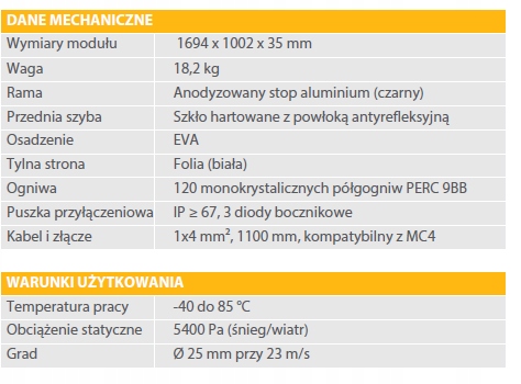 - Kabel połączeniowy: 1x4 mm², 1100 mm, kompatybilne z MC4