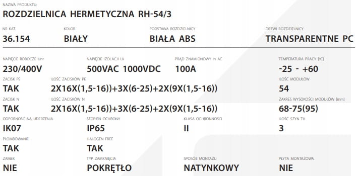- Obudowę natynkową charakteryzuje odporność na temperaturę 960°C (próba rozżarzonym prętem - dotyczy listwy zaciskowej).